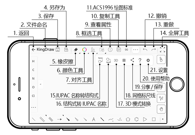 打开KingDrawApp,新建一个文件,你就会看到画板,这里有你绘制化学结构式用到的所有功能。画板分为上、下、左、右四个功能区,接下来,我们就为你详细展示各区域的功能。