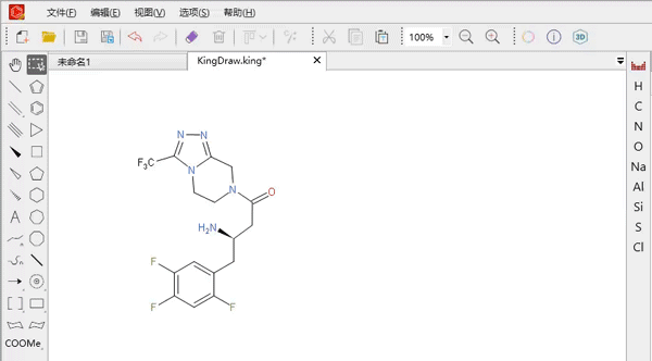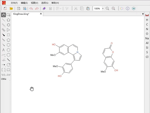 将鼠标移至键的端点或元素上,点击相应元素快捷键,可直接在结构式中替换元素;将鼠标移至化学键上,点击相应键的快捷键,可以直接替换当前化学键。